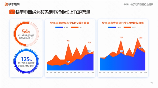 2023年,快手電商數(shù)碼和大家電行業(yè)增長(zhǎng)迅速,其中,數(shù)碼行業(yè)GMV同比增長(zhǎng)超54%,大家電行業(yè)GMV同比增長(zhǎng)125%,連續(xù)三年實(shí)現(xiàn)100%增長(zhǎng)。2024年快手電商消電家居行業(yè)將以用戶為中心,建立優(yōu)價(jià)好物消費(fèi)者心智,升級(jí)全域經(jīng)營(yíng)策略,積極引入更多優(yōu)質(zhì)品牌和品類,不斷豐富供給。