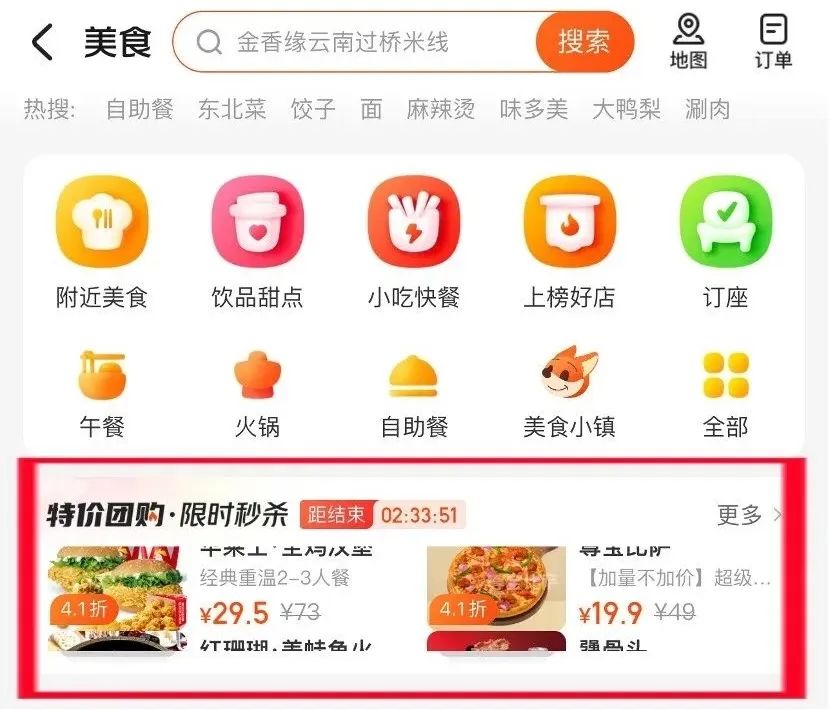 當時,在美團圈圈平臺上,特價商品的折扣力度相當大,普遍不低于美團團購價格的80%,甚至有些頭部連鎖餐飲品牌的商品折扣更是高達50%~60%。