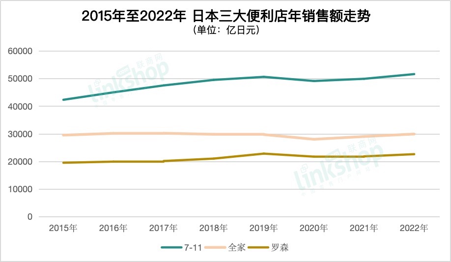 其中,眾所周知,7-11具有強大的市場影響力,2022年其加盟店和直營店的總銷售額達到了約5.1萬億日元(約合2480億人民幣),遠遠超過全家的約3萬億日元(約合1459人民幣)和羅森的約2.3萬億日元(約合1119億人民幣)。從年銷售額的變化走勢來看,很明顯,7-11正在逐漸拉開與全家和羅森之間的差距。
