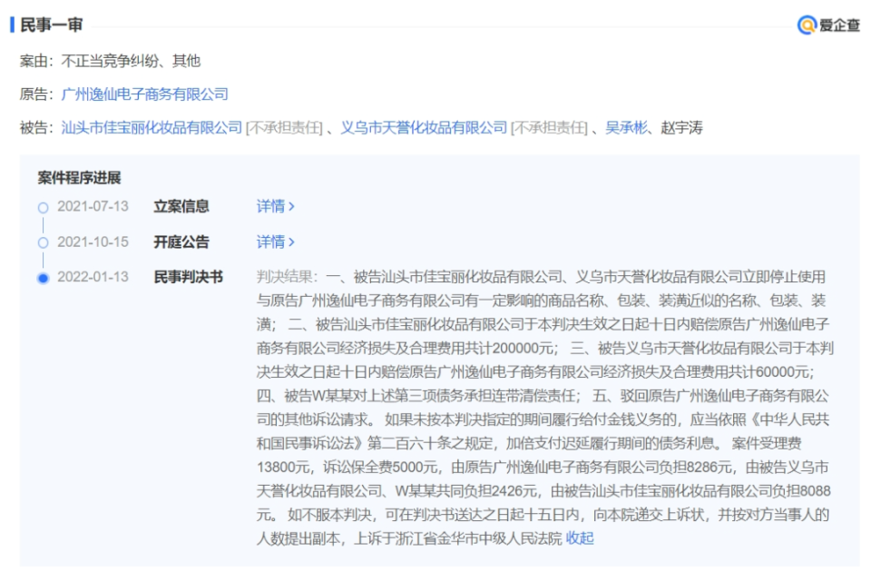 2021年7月,完美日記母公司逸仙電商就曾提起訴訟,稱義烏天譽(yù)公司在其拼多多網(wǎng)店(店鋪名稱:NVN0天譽(yù)專賣店)銷售的口紅產(chǎn)品與完美日記此前出品“小細(xì)跟”口紅包裝高度相似,并使用“小細(xì)跟”商品名稱,銷量超過10萬件,故索賠100萬元。結(jié)果法院最終只判處義烏市天譽(yù)化妝品有限公司賠償6萬元。