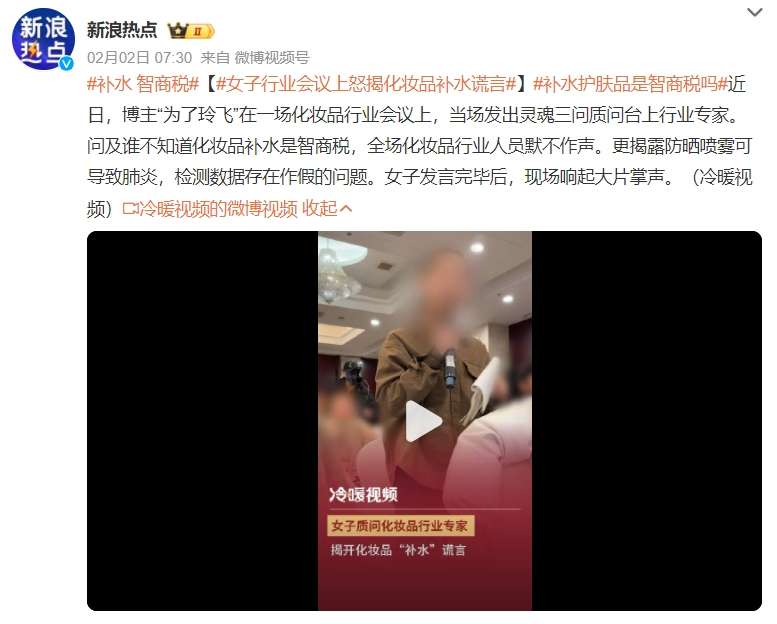 1月30日,自媒體賬號“為了玲飛”發(fā)布了一條名為“一次得罪靈魂的拷問”的視頻,視頻中自稱是“95后配方師”的女生在一場化妝品行業(yè)會議上,提出了“補(bǔ)水是智商稅”的觀點(diǎn),并當(dāng)場質(zhì)問臺上行業(yè)專家。視頻發(fā)布后,關(guān)于“補(bǔ)水到底是不是智商稅”的話題引起熱議。