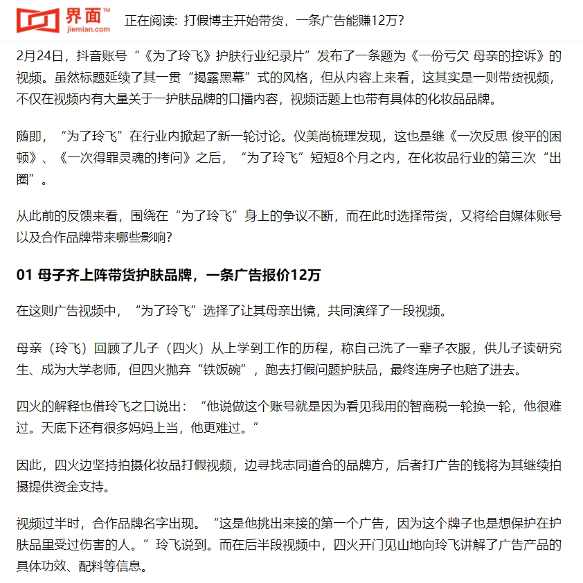 然而,除了假貨之外,一種新型的“打假生意”,也正在形成。有的“打假”看似是在揭露行業(yè)弊端,但實際上卻是在利用受眾的獵奇心態(tài)賺取流量,甚至帶貨“三無產(chǎn)品”;這也讓本就混雜的美妝產(chǎn)品,變得更加“真假難辨”。
