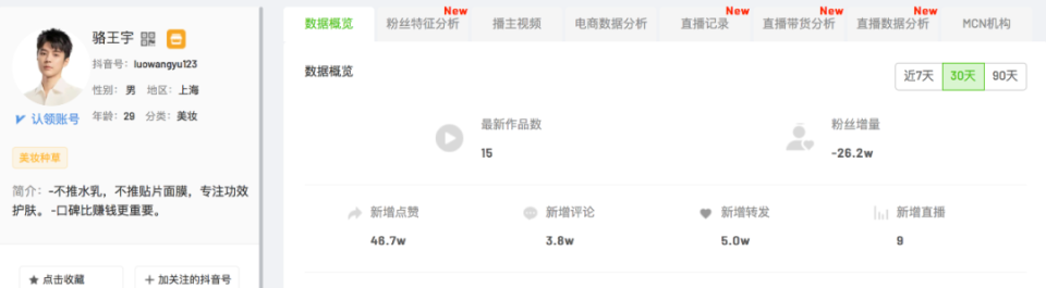 而駱王宇本人則因這次選品失誤,口碑和粉絲大降。飛瓜數(shù)據(jù)顯示,駱王宇本人在30天內(nèi)掉了26.2w的粉絲;且他本人也被網(wǎng)友扒出,和CSS的幕后老板有更為復(fù)雜的交易關(guān)系,團(tuán)隊信譽(yù)再次被拉低。
