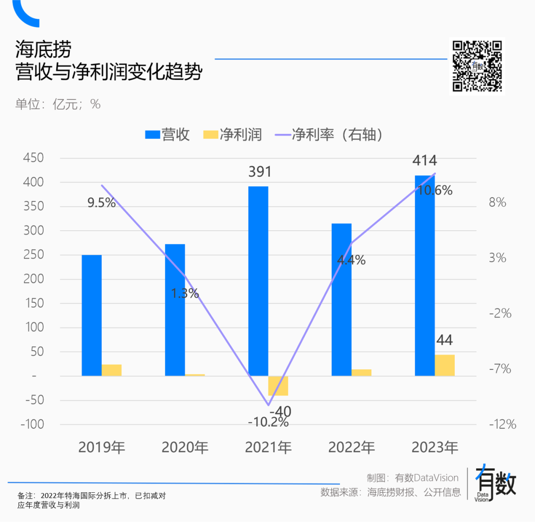 各地海底撈陪消費(fèi)者熱鬧了一整年,最終也實(shí)實(shí)在在地賺了錢:2023年,海底撈營(yíng)收與利潤(rùn)均創(chuàng)下歷史新高,分別不低于414億與44億。
