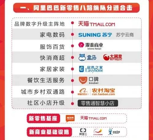 蘇寧、銀泰、盒馬、大潤發(fā)、村淘、居然之家、餓了么等,配合阿里云、菜鳥、支付寶、淘寶、天貓,阿里稱之為八個新零售縱隊。