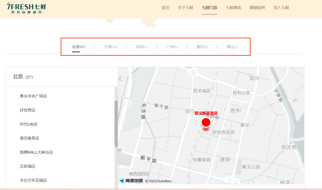 7FRESH官網(wǎng)顯示,有七鮮超市店52家、七鮮生活店17家。這和當初的目標差距可有點大。