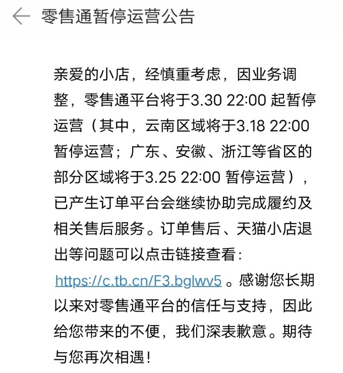 聯(lián)商快訊:3月19日消息,日前,阿里零售通已分別向商家和天貓小店發(fā)布暫停運(yùn)營(yíng)通知稱:經(jīng)慎重考慮,零售通平臺(tái)將于3.30 22:00 起暫停運(yùn)營(yíng)(其中,云南區(qū)域?qū)⒂?.18 22:00暫停運(yùn)營(yíng);廣東、安徽、浙江等省區(qū)的部分區(qū)域?qū)⒂?.25 22:00 暫停運(yùn)營(yíng)),已產(chǎn)生訂單需要您繼續(xù)完成履約及售后服務(wù)。因此給您帶來(lái)的不便,我們深表歉意。期待與您再次相遇!