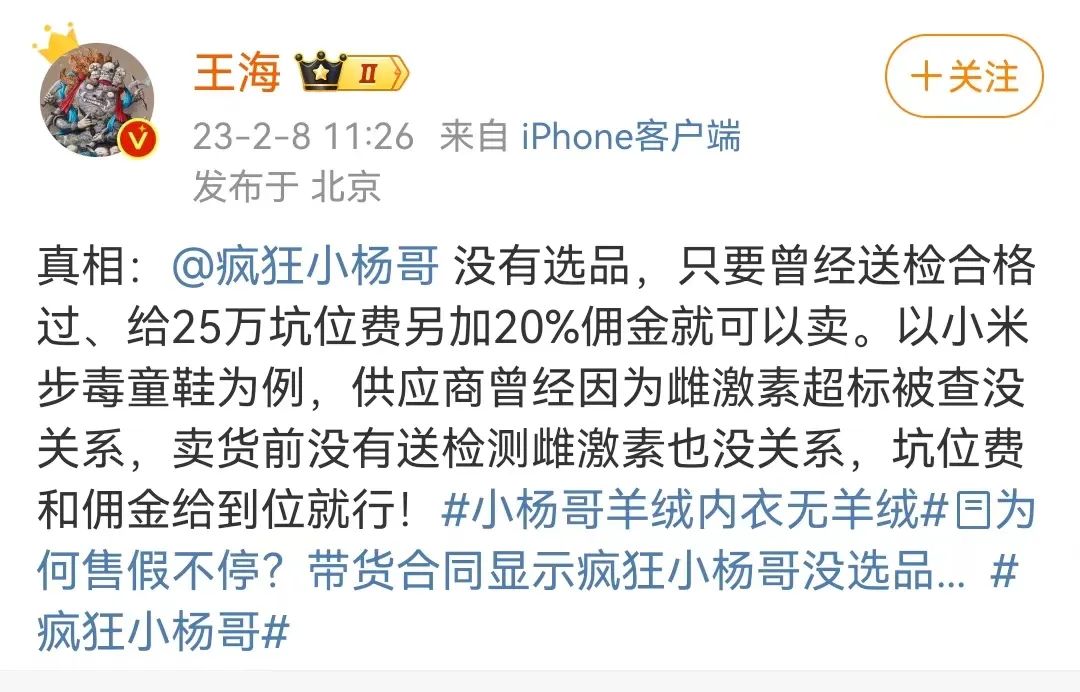 直到現(xiàn)在,王海仍然在微博置頂了其曝光小楊哥選品問題的博文。王海披露,小楊哥沒有選品,只要曾經(jīng)送檢合格過、給25萬坑位費另加20%傭金就可以賣。