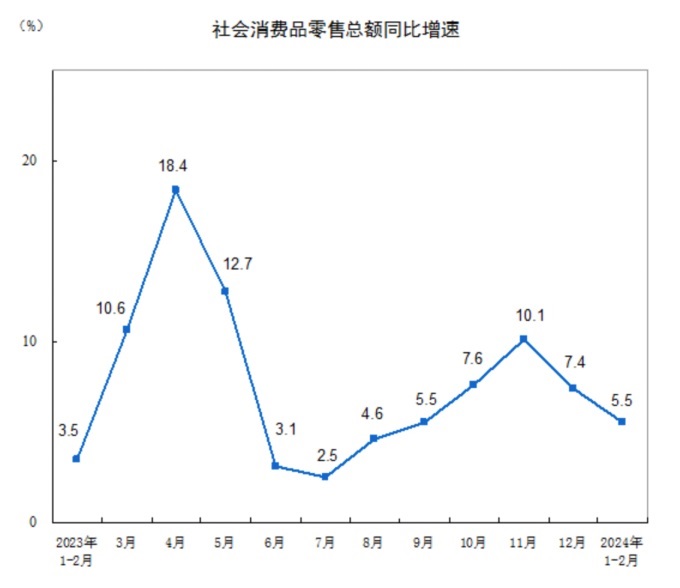 1-2月社會消費品零售總額同比增長5.5%