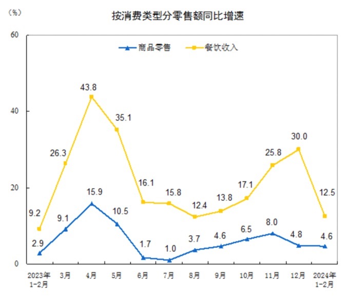 按消費類型分,1-2月份,商品零售71826億元,同比增長4.6%;餐飲收入9481億元,增長12.5%。