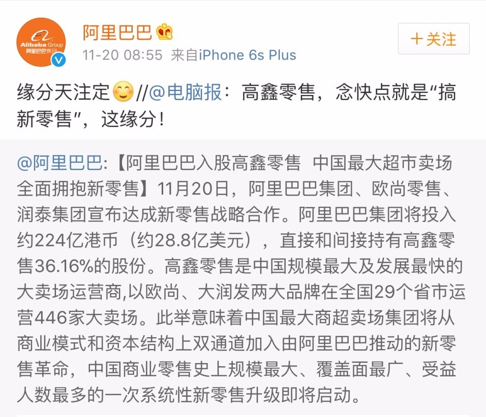 這一年,阿里正式控股高鑫零售,宣布最初的設(shè)想已經(jīng)全部實(shí)現(xiàn),順便貢獻(xiàn)了一個(gè)諧音梗。