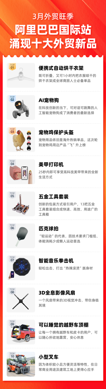 3月20日,阿里國(guó)際站發(fā)布的“十大外貿(mào)新品”,AI寵物狗、寵物雞保護(hù)頭盔、美甲打印機(jī)、智能拳擊訓(xùn)練器、3D全息影像風(fēng)扇等不同以往的新品進(jìn)入今年的“十大”行列。