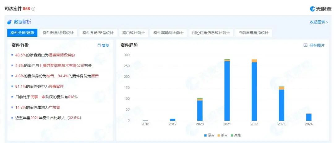 公司涉及司法案件共有868件,其中48.5%的涉案案由為侵害商標(biāo)權(quán)糾紛,4.8%的案件與上海尋夢信息技術(shù)有限公司有關(guān);4.6%的案件身份為被告,94.4%的案件身份為原告,81.1%的案件類型為民事案件。