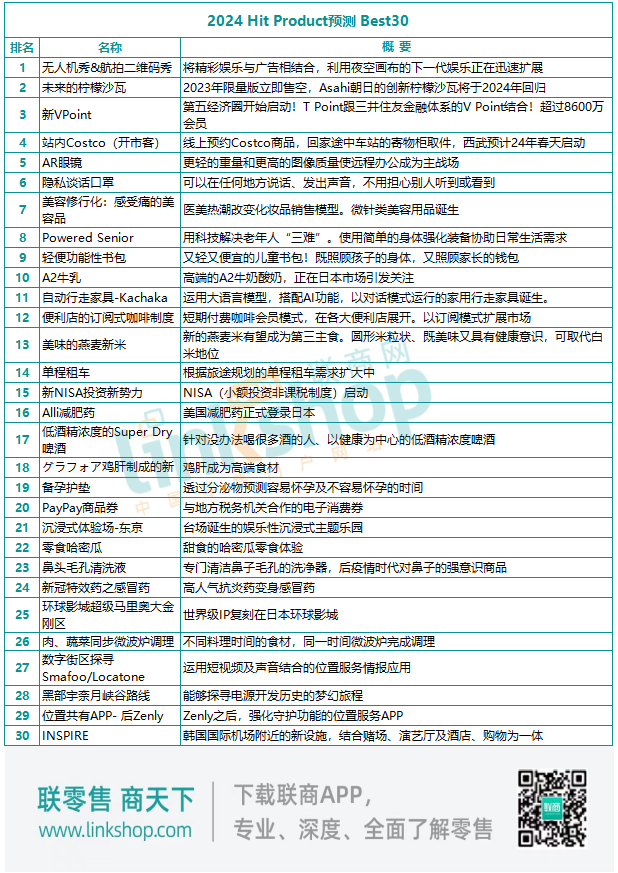 日經(jīng)Trendy雜志以其敏銳的潮流觀察力,推出了“2023年度熱賣(mài)商品TOP30”以及“2024年度熱銷(xiāo)預(yù)測(cè)TOP30”的專(zhuān)題推薦,其中包含各種商品及服務(wù)項(xiàng)目,清單如下: