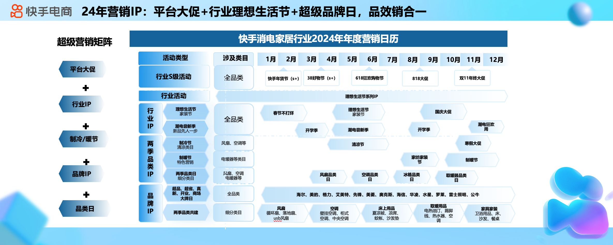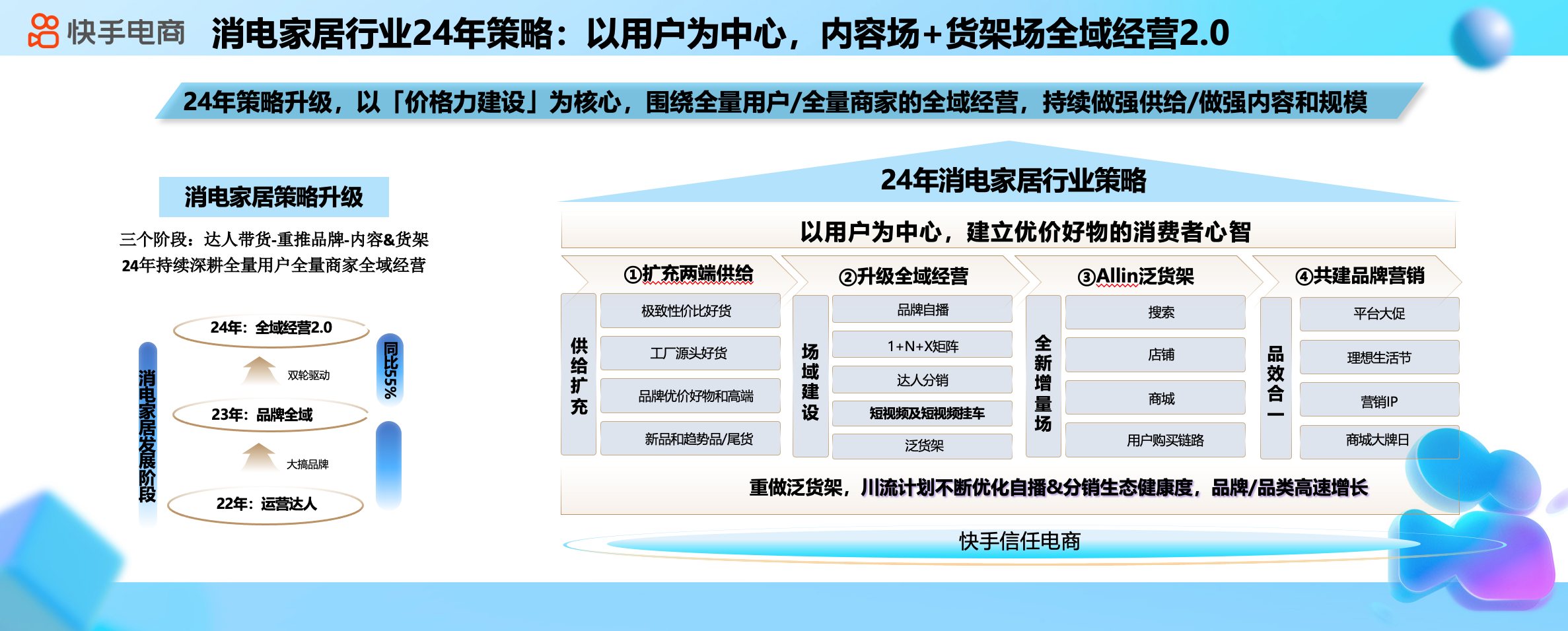 面向2024年,快手電商消電家居行業(yè)將以用戶為中心,建立優(yōu)價(jià)好物的消費(fèi)者心智,在充分?jǐn)U充品類及品牌兩端供給的同時(shí),升級(jí)全域經(jīng)營策略,鼓勵(lì)商家做好內(nèi)容場域和泛貨架場景經(jīng)營,借助快手信任社區(qū)生態(tài),做好品牌營銷,提升品牌在快手站內(nèi)的知名度。