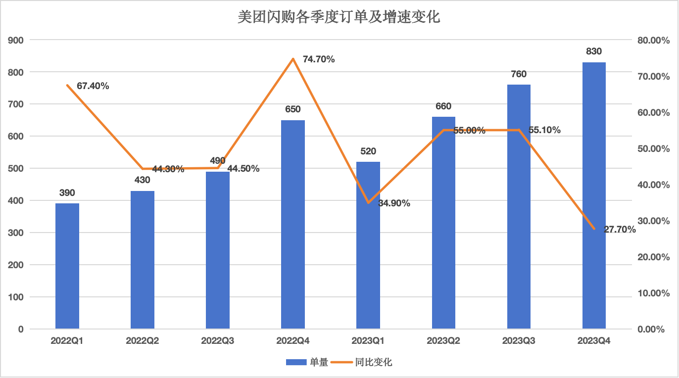 剛過去的Q4,美團(tuán)首次披露了閃購(gòu)的日均單量,四季度這一數(shù)字達(dá)到了830萬,創(chuàng)出歷史新高,同比增速27.7%。盡管環(huán)比有所下降,但考慮去年疫情放開后的高基數(shù),這一增速仍然超出外界預(yù)期。