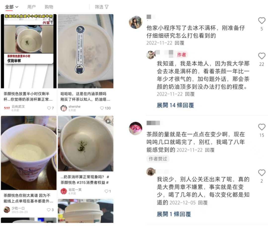 服務不討喜之外,放置半小時僅剩半杯的產(chǎn)品則讓茶顏悅色的口碑再次下跌。今年315期間,伴隨著古茗、茶百道等奶茶品牌被點名,茶顏悅色的“消杯”問題再次被提及并登上微博熱搜。