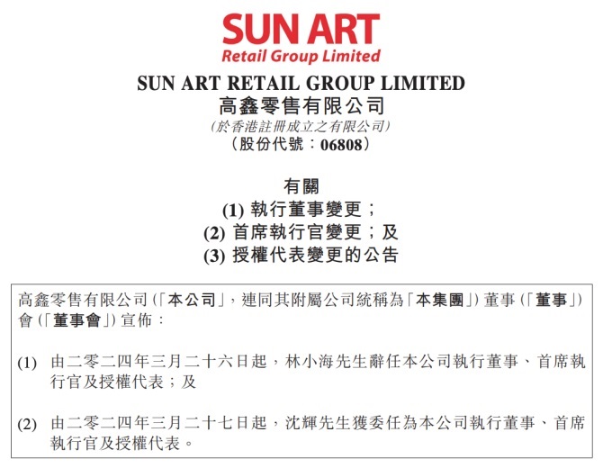 聯(lián)商快訊:3月26日晚間,高鑫零售在港交所發(fā)布公告稱,自2024年3月26日起,林小海辭任公司執(zhí)行董事、首席執(zhí)行官及授權代表。2024年3月27日起,沈輝獲委任為公司執(zhí)行董事、首席執(zhí)行官及授權代表。