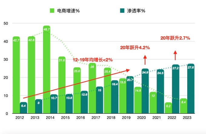 圖1 國(guó)內(nèi)實(shí)物2012-2023年電商增速和電商滲透率