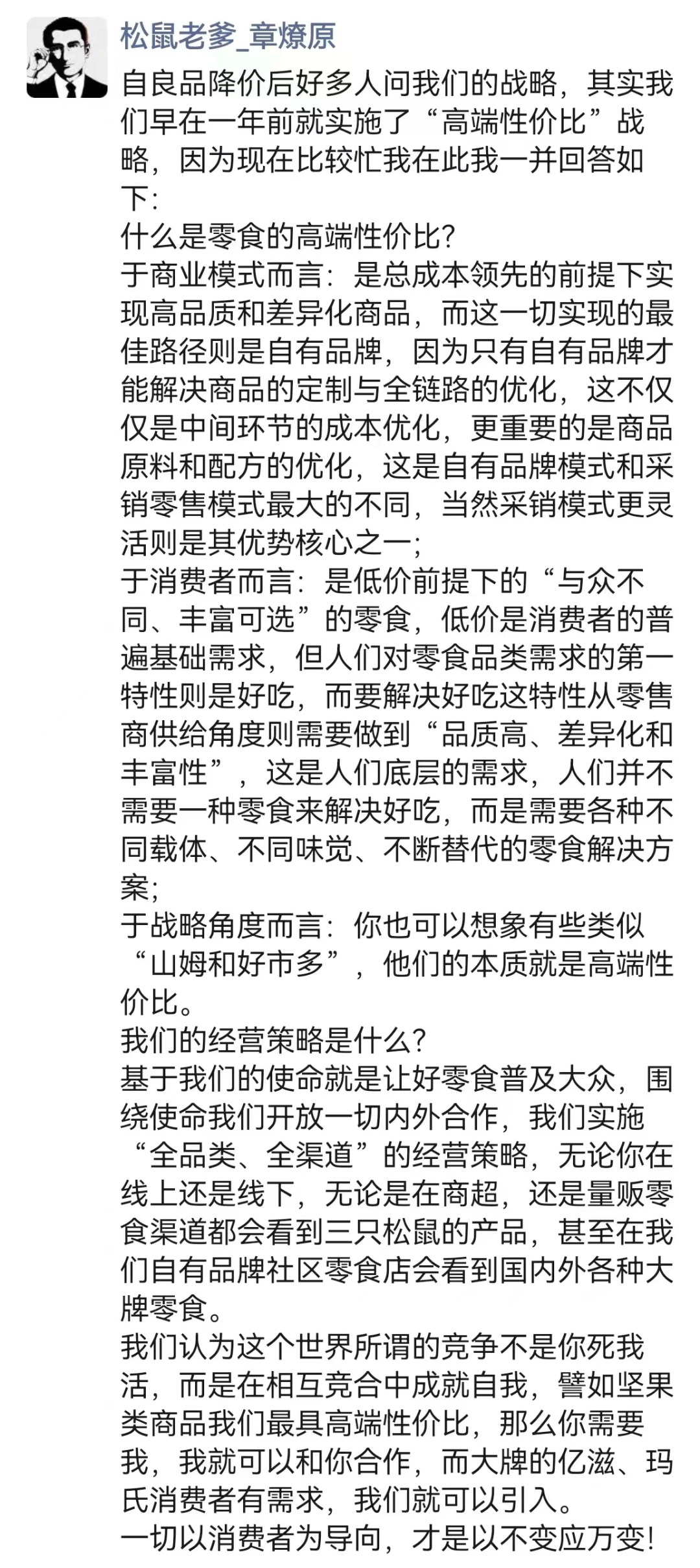 在財(cái)報(bào)中,三只松鼠提到的高端性價(jià)比,三只松鼠創(chuàng)始人章燎原曾在朋友圈做過解釋,其本質(zhì)是通過供應(yīng)鏈與效率的優(yōu)化,做到貨好價(jià)更好。