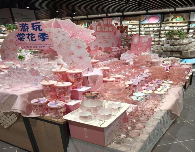 這是季節(jié)性主題突出,現(xiàn)在在我們店還陳列著的櫻花主題,我們把櫻花主題商品,杯子、水杯、碗、盤子、碟子等等全部放在一起,方便顧客一次性購買上,整體氛圍也是非常好的。
