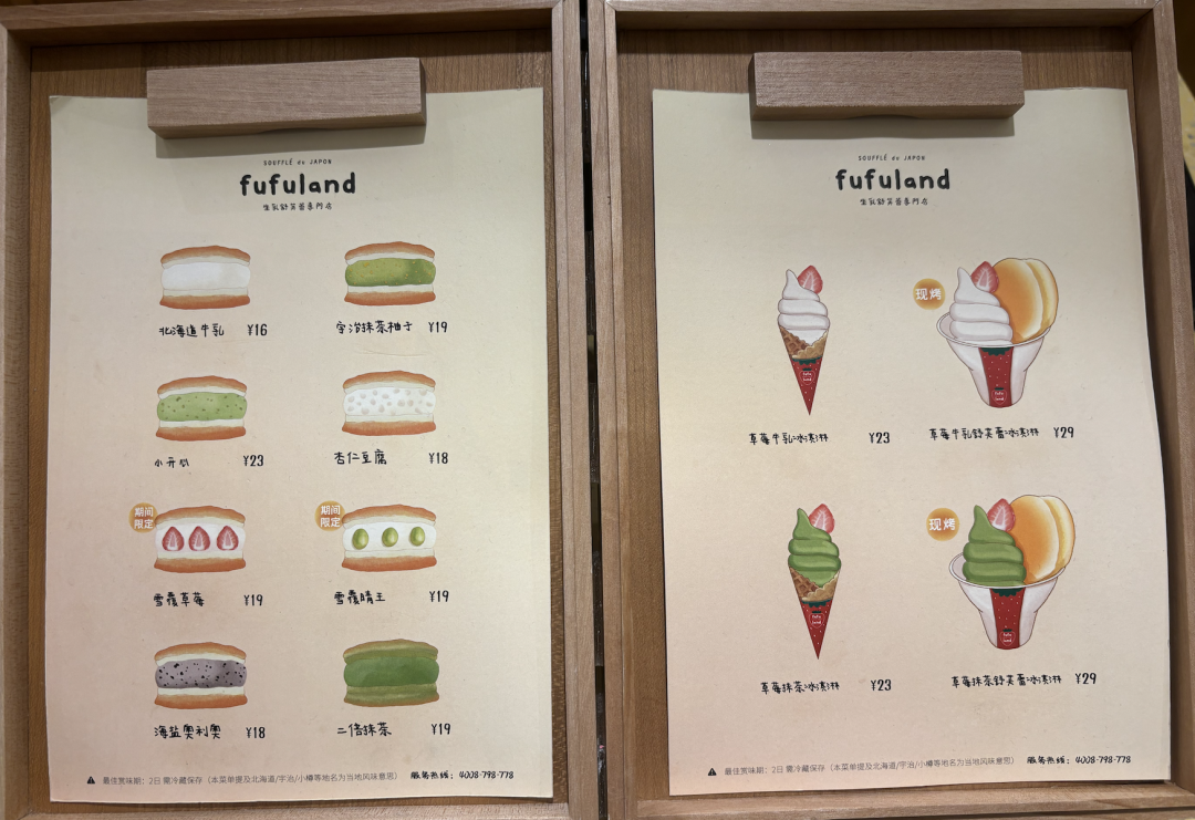 門店模型、產品和fufuland很相似,但產品上創(chuàng)新出了 “冰心”舒芙蕾這種新概念。
