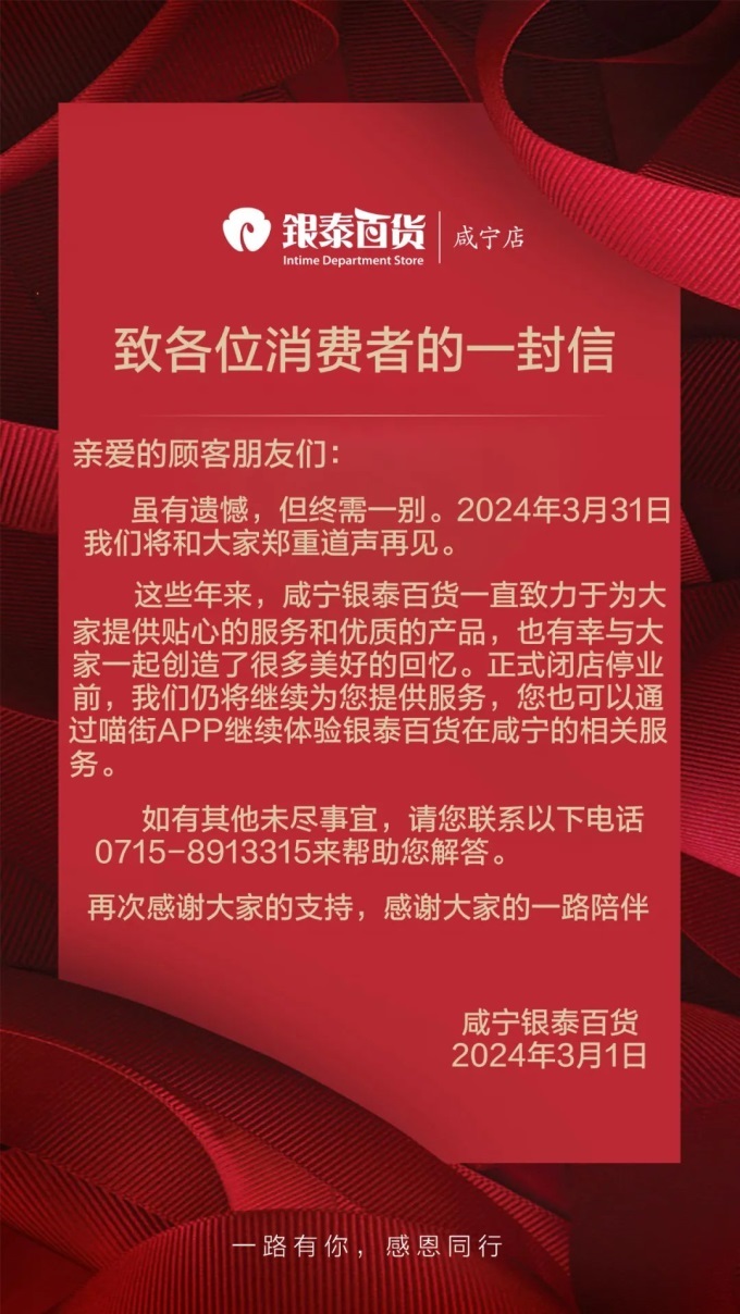 咸寧銀泰百貨3月31日關(guān)閉