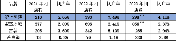 而對于加盟商來說,2021年、2022年、2023年前三季度,滬上阿姨期內(nèi)閉店數(shù)分別為210家、393家、298家,閉店率分別為5.66%、7.49%、4,11%;同期蜜雪冰城的閉店率分別為2.89%、2.41%、2.37%;古茗閉店率為3.60%、5.13%、2.94%(2023年全年數(shù)據(jù));茶百道閉店率則為0.2%、1.1%、2.8%(2023年全年數(shù)據(jù))。