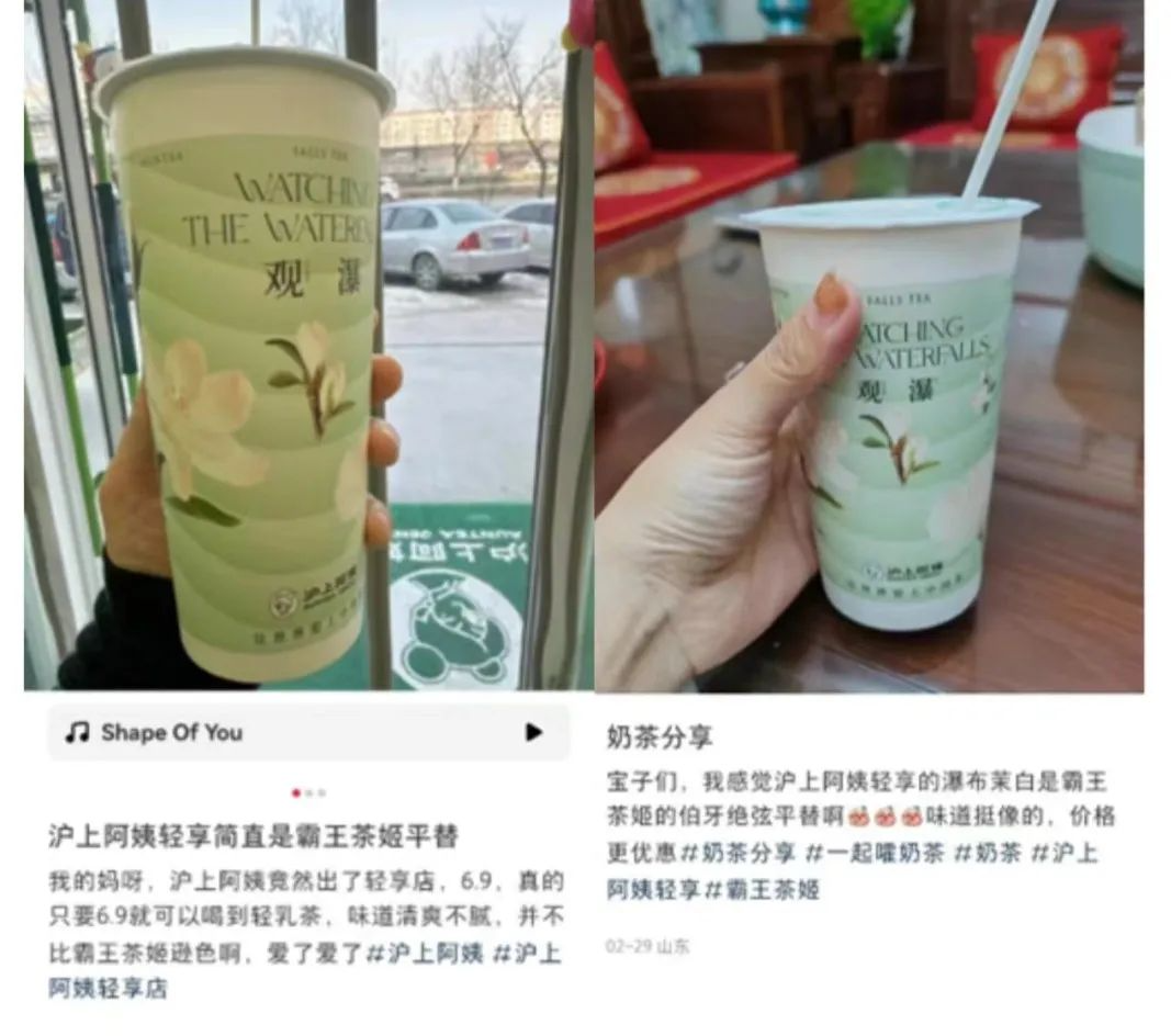 可以看出,茶瀑布在深入下沉市場的同時選擇了差異化策略,盡量避免與頭部“硬剛”!捌絻r國潮輕乳茶”的定位,在價格上對標(biāo)蜜雪冰城,在國潮概念和輕乳茶口感上則與霸王茶姬相似。在社交平臺上,消費者更是將“滬上阿姨輕享版”的產(chǎn)品稱為“霸王茶姬平替”。