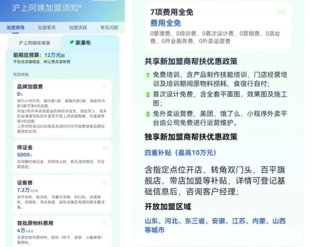 基于此,滬上阿姨在推出茶瀑布的同時也推出了更為優(yōu)惠的加盟政策。根據(jù)滬上阿姨官方加盟信息可知,不包含店面租金、轉(zhuǎn)讓費和裝修費的茶瀑布前期總預(yù)算為12萬元,其中給到了7項費用全免(0管理費、0培訓(xùn)費、0首次設(shè)計費、0營銷費、0選址費、0開業(yè)服務(wù)費、0外賣運營費)的優(yōu)惠政策。