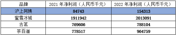 而蜜雪冰城2021年凈利潤達(dá)到19.11億元,2022年凈利潤則達(dá)到了20億元;古茗2021年凈利潤7.7億元,2022年則為7.88億元;茶百道2021年凈利潤為7.78億元,2022年達(dá)到了9.65億元。