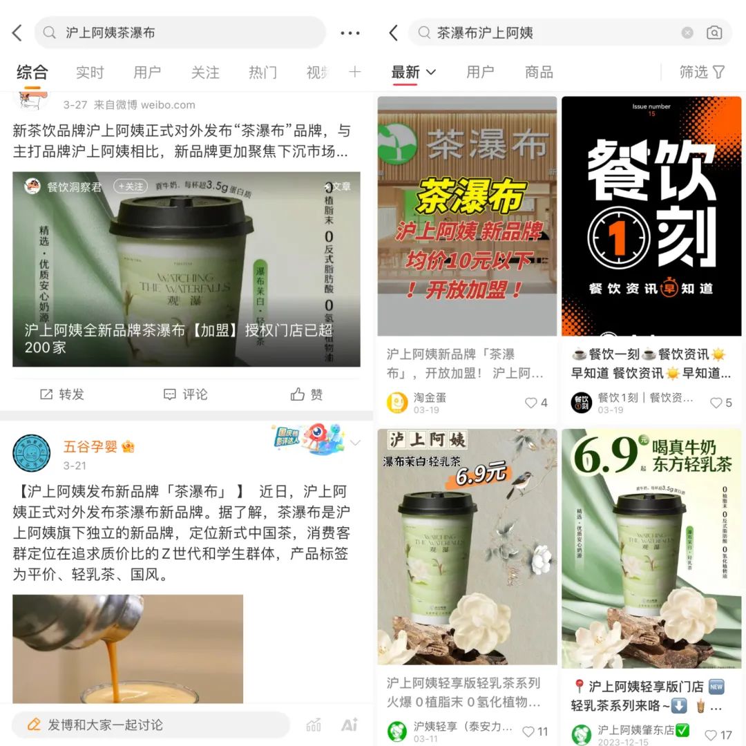 一方面,官方聲稱茶瀑布在全國已有200多家門店,但是在社交平臺上搜索“茶瀑布”關(guān)鍵詞,只能檢索到宣傳模型圖,缺乏更多有關(guān)門店細(xì)節(jié)和產(chǎn)品細(xì)節(jié)的公開信息。