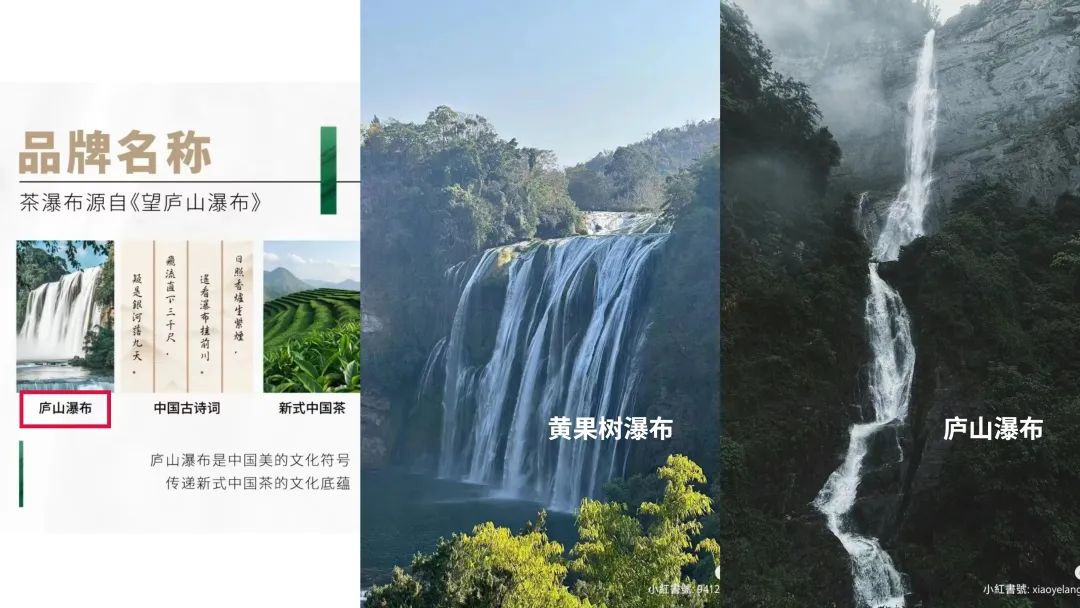 茶瀑布公眾號的宣傳推文稱,“茶瀑布”一名靈感來源于詩詞“望廬山瀑布”,品牌想以此作為中國美的文化符號,配圖卻選擇了黃果樹瀑布的圖片。