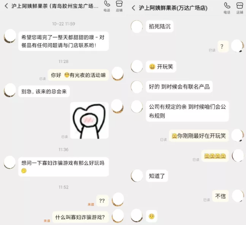 在玩家私信、電聯(lián)滬上阿姨各門店,詢問活動詳細(xì)情況時,滬上店員發(fā)言不當(dāng),稱“想問一下寡婦詐騙游戲有那么好玩嗎”,甚至出現(xiàn)辱罵游戲角色的情況。這引發(fā)了大量玩家的不滿,將聊天記錄轉(zhuǎn)載至網(wǎng)絡(luò),滬上阿姨被推上了風(fēng)口浪尖,輿論持續(xù)發(fā)酵。