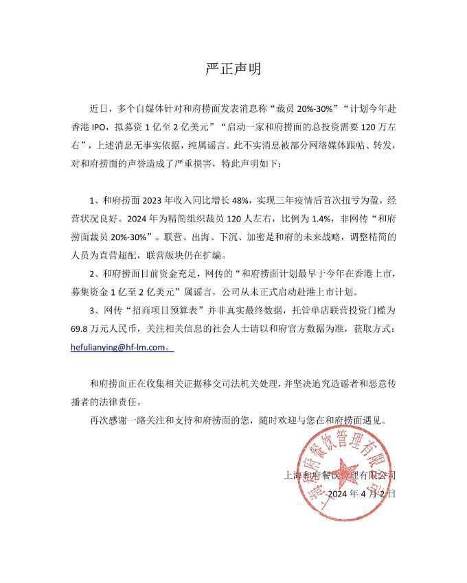 和府撈面在聲明中表示,近日,多個(gè)自媒體針對(duì)和府撈面發(fā)表消息稱“裁員20%-30%”“計(jì)劃今年赴香港IP0,擬募資1億至2億美元”“啟動(dòng)一家和府撈面的總投資需要120萬(wàn)左右”,上述消息無(wú)事實(shí)依據(jù),純屬謠言。