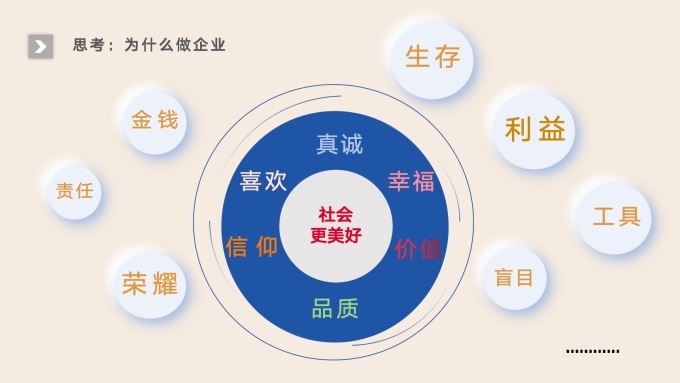 做企業(yè)得先明白為什么要做企業(yè),是為了金錢、責(zé)任、榮耀、生存、利益?還是因為喜歡、真誠、信仰、追求品質(zhì)、創(chuàng)造美好的價值,以及讓社會更美好的愿望?