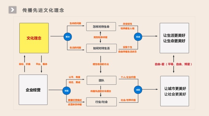 企業(yè)經(jīng)營這一塊我們體現(xiàn)的是創(chuàng)建一個公平、尊重、信任、真誠的平臺,我們有一個健康的經(jīng)營模式、運營體系的樣板,讓團隊或者個人都有一種價值的體現(xiàn),最終的成就是讓城市更美好,讓社會更美好,其實也是讓人類更美好,這是路徑的選擇。