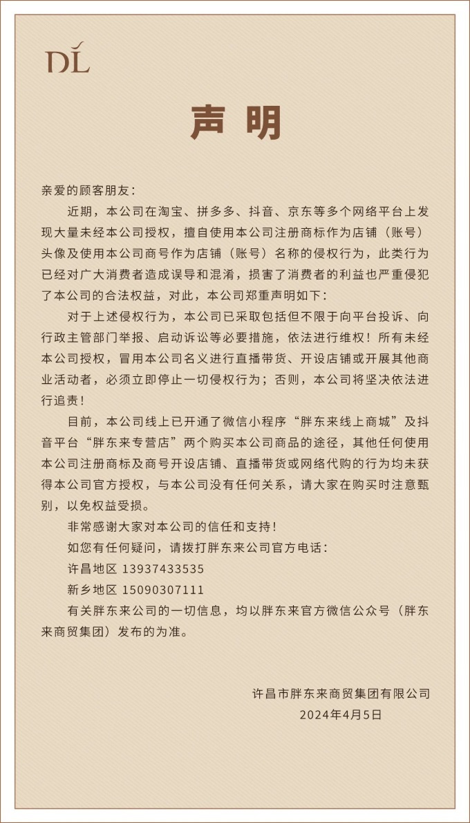聯(lián)商快訊:4月5日,胖東來發(fā)布聲明稱,本公司在淘寶、拼多多、抖音、京東等多個網(wǎng)絡平臺上發(fā)現(xiàn)大量未經(jīng)本公司授權,擅自使用本公司注冊商標作為店鋪 (賬號)頭像及使用本公司商號作為店鋪 (賬號)名稱的侵權行為,此類行為已經(jīng)對廣大消費者造成誤導和混淆,損害了消費者的利益也嚴重侵犯了本公司的合法權益。