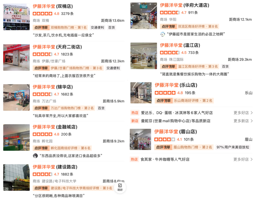 對(duì)于前者,不用細(xì)說,如今只剩下亞運(yùn)村店一家門店,即是最有力的說明;對(duì)于后者,從伊藤洋華堂官方微信公眾號(hào)及美團(tuán)相關(guān)信息看,成都至少有8家門店(另有樂山店、眉山店)。