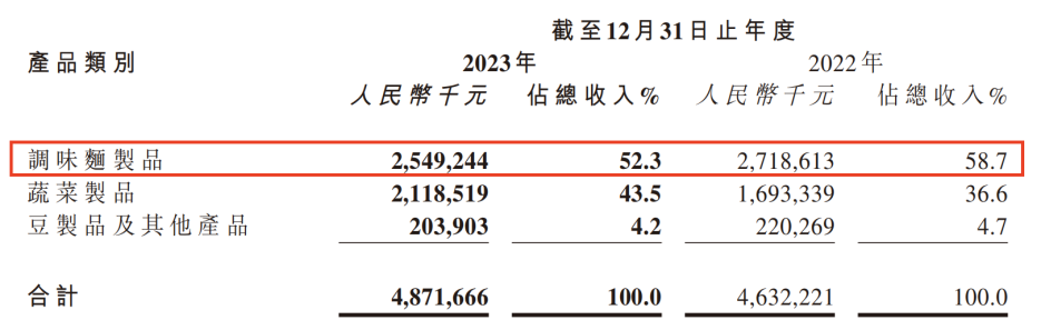 2023年,衛(wèi)龍調(diào)味面制品的產(chǎn)能利用率甚至連一半都不到,僅為48.3%;調(diào)味面制品收入也由2022年的27.19億元減少至2023年的25.49億元,下降6.25%,收入占比由2022年的58.7%下降至2023年的52.3%。