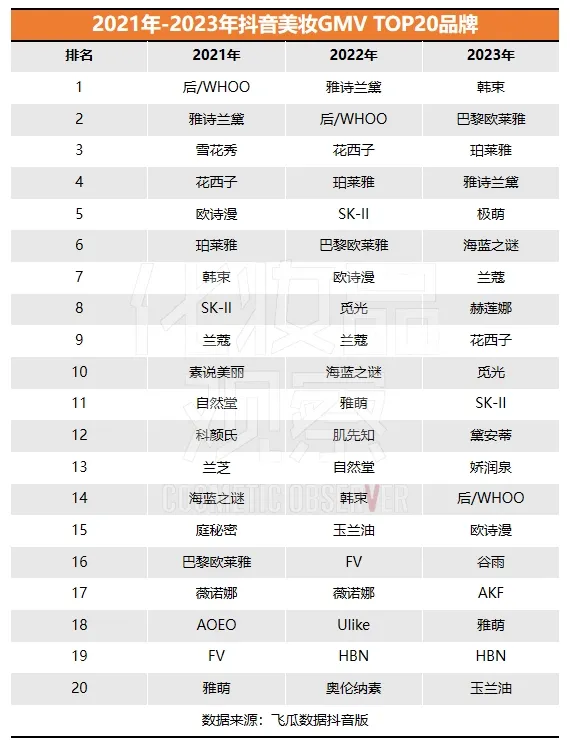 與此同時,國際美妝的市場也不斷遭到更具性價比的國貨美妝的擠壓。在2023抖音美妝GMV排行榜中,韓束以33.4億元GMV實現(xiàn)斷層第一,珀萊雅以22億元GMV位居第三,國貨品牌黛安蒂、嬌潤泉沖進前二十。而雅詩蘭黛在近三年中首次跌出前三,韓系美妝品牌WHOO由2021的榜一跌到如今十名開外。