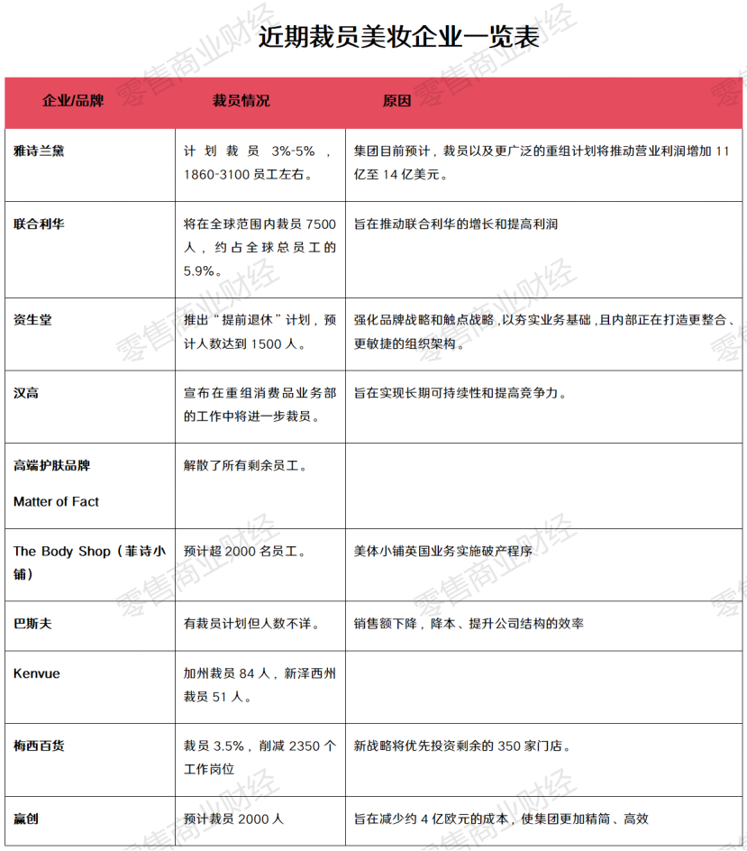 筆者梳理發(fā)現(xiàn),開年以來,雅詩蘭黛、資生堂、巴斯夫、美國高端護膚品牌Matter of Fact、聯(lián)合利華等十余家美妝企業(yè)陸續(xù)宣布裁員。
