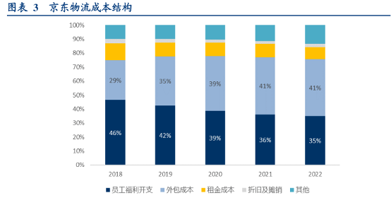 且網(wǎng)點(diǎn)全面運(yùn)營(yíng)下,企業(yè)也同時(shí)承擔(dān)高人力成本、設(shè)備折舊成本、土地租金成本等等。以京東物流為例,其人力成本在京東物流中的占比一直在30%以上。