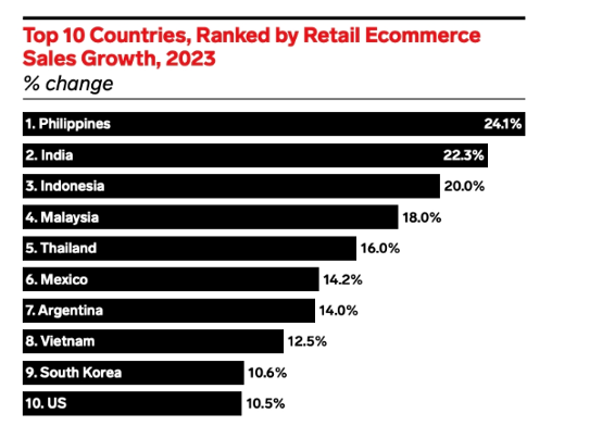除電商平臺(tái)自建物流搶奪市場(chǎng)份額外,據(jù)InsiderIntelligence數(shù)據(jù)顯示,2023年?yáng)|南亞地區(qū)仍是增長(zhǎng)最快的電商地區(qū),連續(xù)第三年位居全球榜首。該地區(qū)的國(guó)家中,菲律賓、印度尼西亞、馬來(lái)西亞、泰國(guó)和越南的電子商務(wù)市場(chǎng)增長(zhǎng)率均位居前十,增長(zhǎng)率超過(guò)12%。