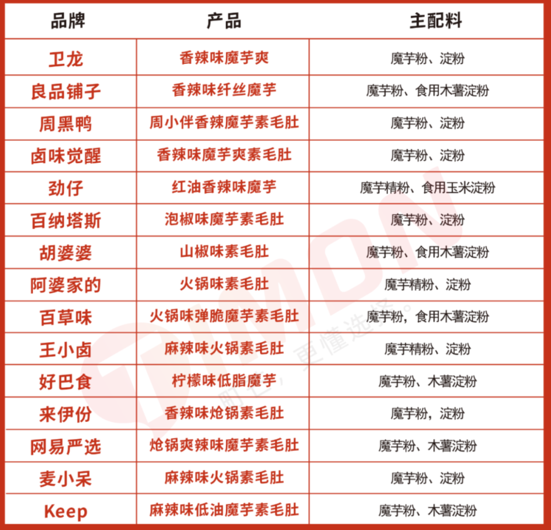 “這三家魔芋爽的味道都差不多?”一位名為“小バ”的用戶在對(duì)比了不同品牌魔芋爽后,在小紅書(shū)上記錄了自己的困惑?疵郑冀心в笏;嘗口味,都是常見(jiàn)的火鍋味;看配料表,都是魔芋粉+淀粉+相似的調(diào)料與添加劑。各家品牌魔芋產(chǎn)品“撞衫”,并非偶然性事件。
