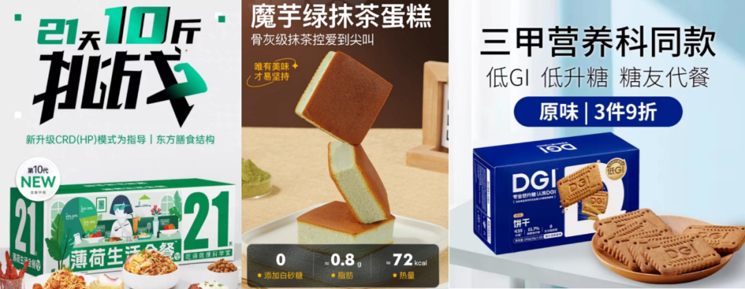例如,薄荷健康推出的“21天10斤挑戰(zhàn)”全食餐中,魔芋扮演了重要角色,它不僅是作為控卡餐的魔芋谷物飯,還是蛋白棒、果凍等減脂期小零食的主要原料。輕食品牌暴肌獨(dú)角獸,在其魔芋蛋糕天貓商品詳情頁(yè)中,會(huì)計(jì)算出每塊蛋糕的熱量,標(biāo)明“控卡期定制蛋糕”?靥鞘称菲放艱GI則會(huì)在天貓商品詳情頁(yè)中,為其魔芋粗糧餅干注明“三甲營(yíng)養(yǎng)科同款 低GI 低升糖 糖友代餐”。