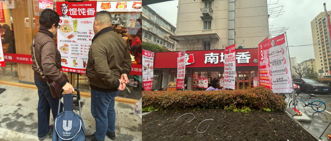 首店正門面向打虎山路,并設(shè)置水旗和KT版招攬生意?拷亟犯傻酪粋(cè)門頭為「飯香 串香 餛飩香」等賣點(diǎn),地鐵出站口及過馬路時很容易關(guān)注到。
