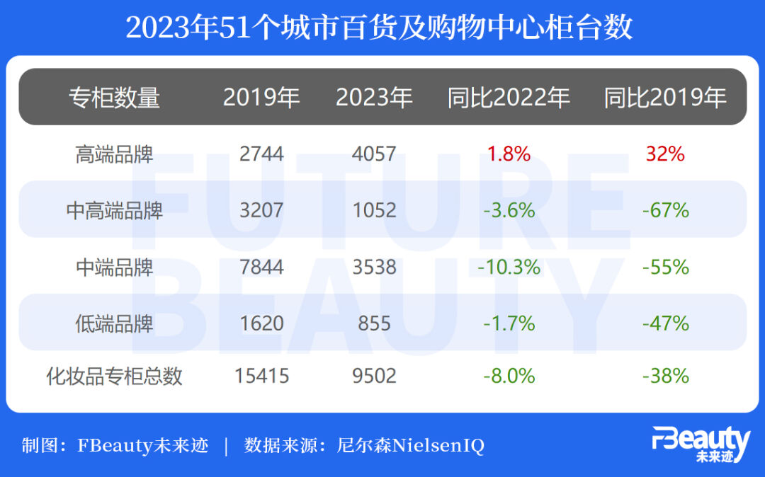 尼爾森NielsenIQ獨(dú)家提供給《FBeauty未來跡》的數(shù)據(jù)顯示,全國51個城市的百貨購物中心化妝品柜臺總數(shù),從2019年3月到2023年直接減少了近6000個。