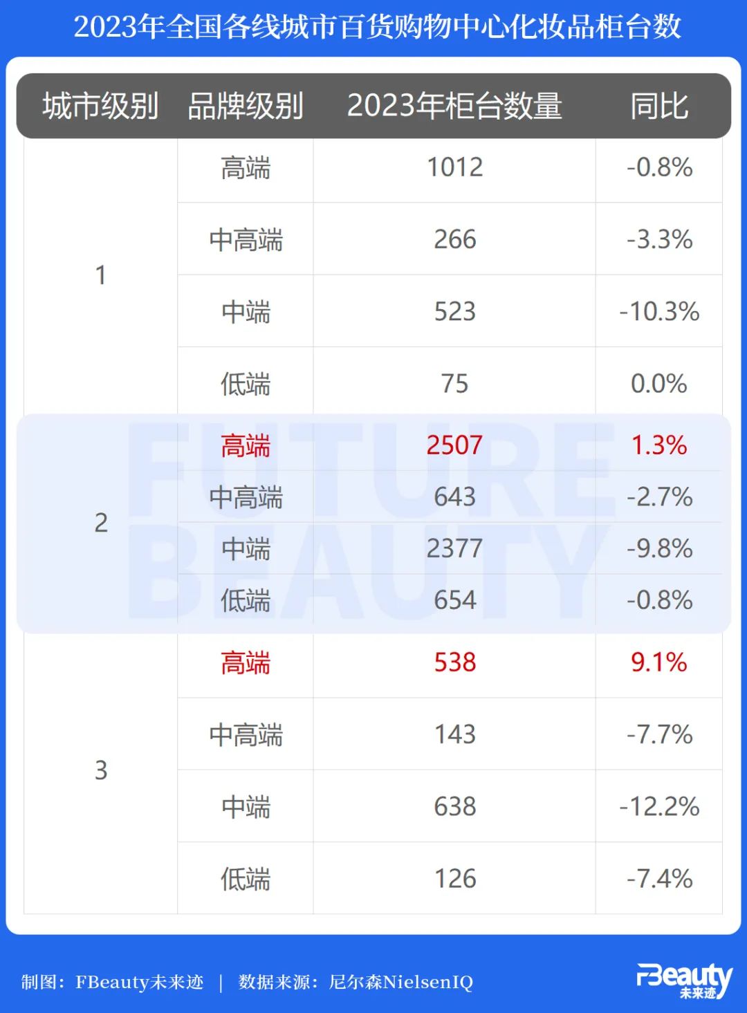 但從另一個數(shù)據(jù)看,化妝品柜臺減少更根源性的原因,一方面在于購百渠道主流外資化妝品集團(tuán)主動的策略型調(diào)整,另一方面則是購百化妝品生態(tài)“高端化”汰換的結(jié)果。