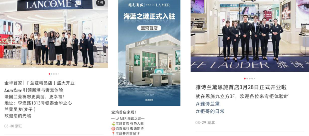 其中,許多商場會打出某品牌“區(qū)域首店”的稱號擴(kuò)大宣傳,例如寶雞開元商城開出的海藍(lán)之謎為寶雞首店、金華之心銀泰開出的蘭蔻為金華首店、恩施九立方開出的雅詩蘭黛為恩施首店,以高端化妝品品牌首店來吸引輻射區(qū)域內(nèi)的消費(fèi)者。